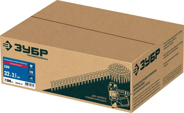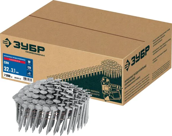 - ЗУБР CRN 32 х 3.1 мм, барабанные гвозди кровельные оцинкованные, 7200 шт (305385-32)