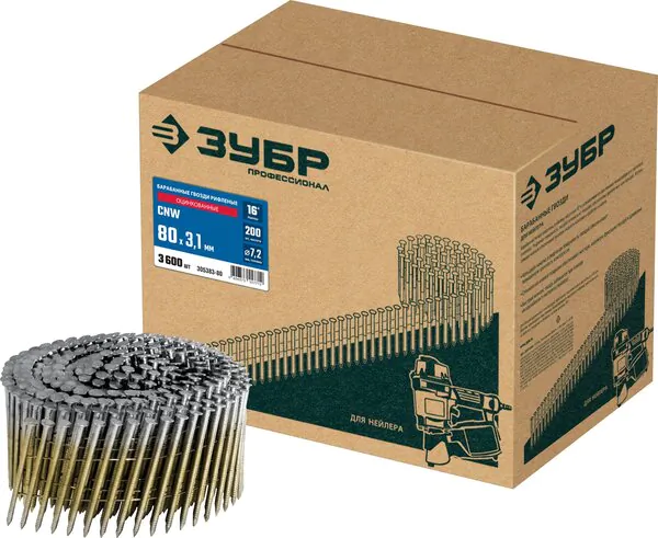 - ЗУБР CNW 80 х 3.1 мм, барабанные гвозди рифленые оцинкованные, 3600 шт (305383-80)