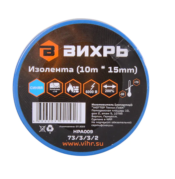 Изолента Вихрь ПВХ 10м*15мм синяя 73/3/3/2