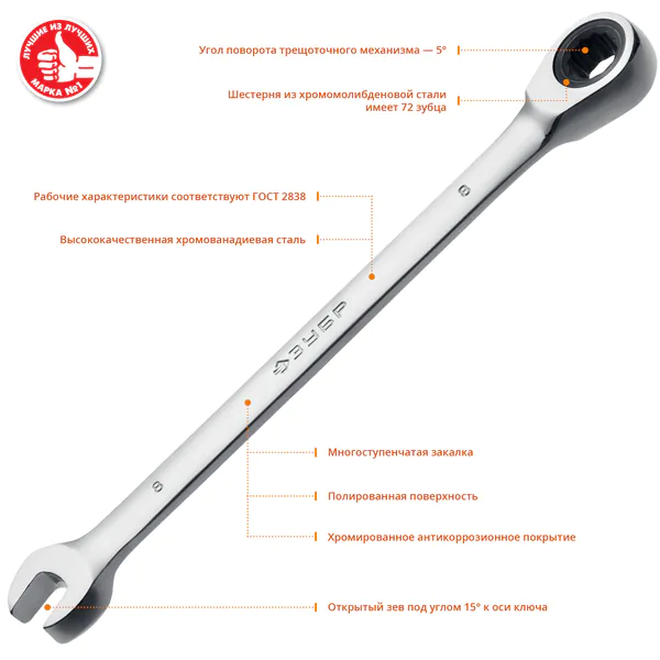 Ключ гаечный комбинированный трещоточный Зубр 8мм 27074-08_z01