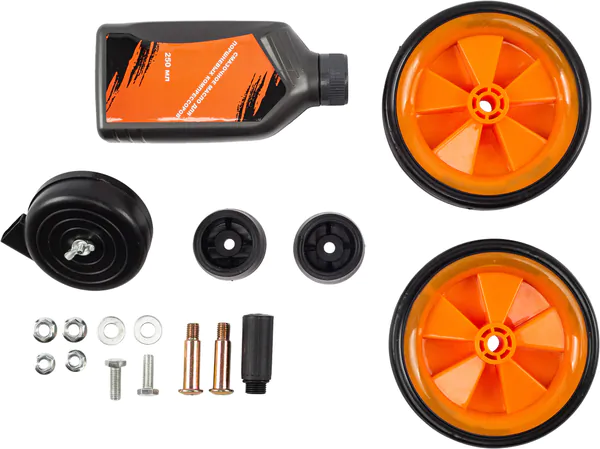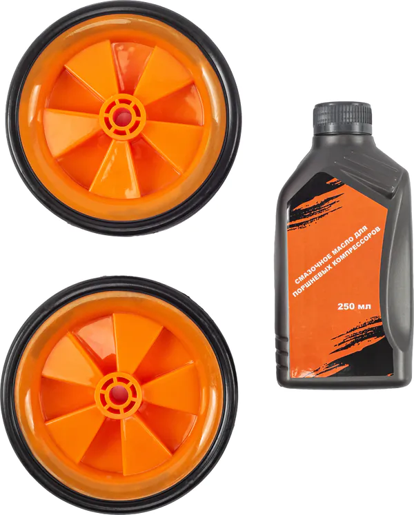 - Паспорт изделия, Колеса, Воздушный фильтр, Резиновая подножка, Сапун, Смазочное масло для компрессоров