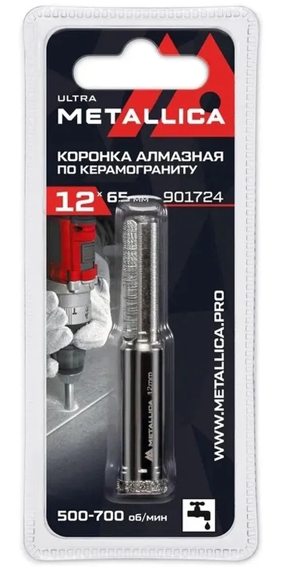 Коронка алмазная METALLICA Ultra 12*65мм, #60, по керамограниту, плитке в блистере 901724