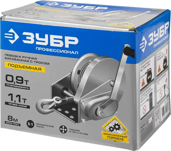 Лебедка ручная барабанная тросовая Зубр Профессионал 0.9т 8м 43117-0.9