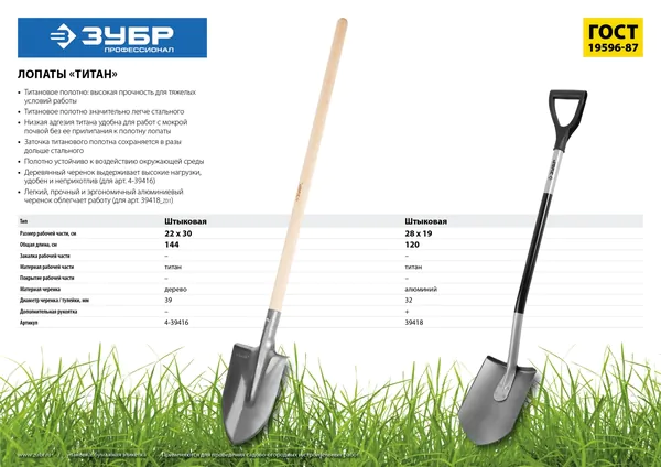 - ЗУБР Титан, 280 х 190 х 1200 мм, полотно 2 мм, титановая, алюминиевый изогнутый черенок с рукояткой, тип ЛКО, штыковая лопата, Профессионал (39418) 39