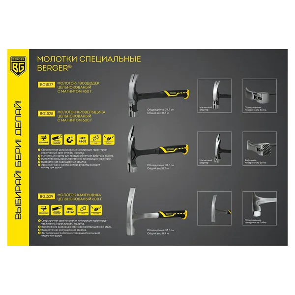 - • молоток каменщика Berger цельнокованый 600 г BG1529.