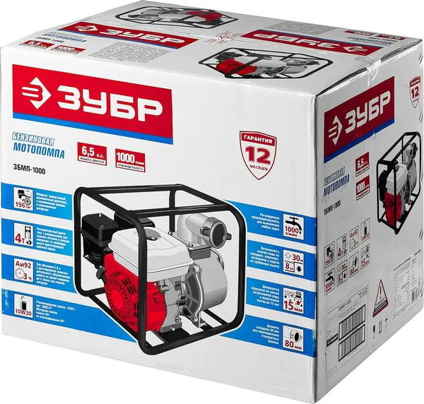 Ёмкость топливного бака, л3.6Расход топлива, л/ч1.2Max мощность, Вт4800Допустимый диаметр твердых частиц, мм15СтартерМощность двигателя, л.с.6.5Глубина всасывания, м8Диаметр входного отверстия, мм80Высота подъема, м30Производительность на входе, л/мин1000УпаковкаТип двигателяОбъем двигателя, куб.см196Условия гарантии60 месяцевДиаметр выходного отверстия (мм)Вид топливабензин АИ-92Габариты товара (ДхШхВ), мм600*430*470Масса нетто, кг30.3Габариты упаковки (ДхШхВ), мм620*500*51Вес брутто, кг27