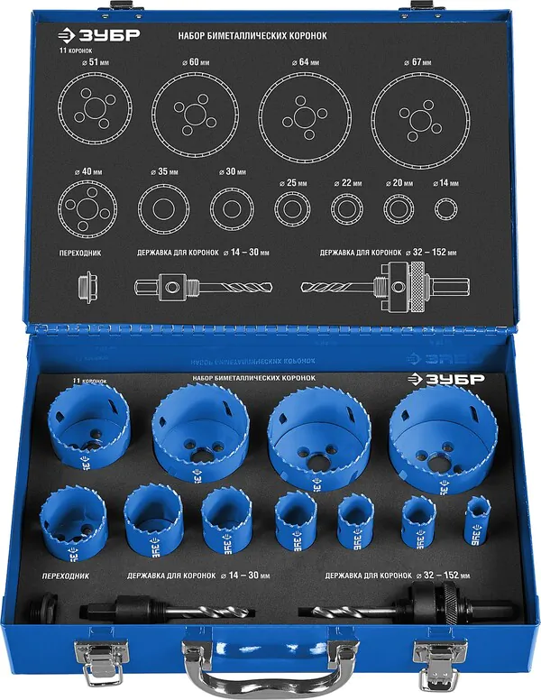 - ЗУБР 11 шт, сталь Р6М5, (14,20,22,25,30.35,40.51.60,64,67), набор биметаллических коронок (29531-H11)