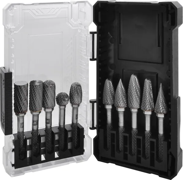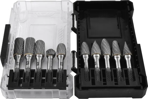 - Набор борфрез твердосплавных, тип A, B, C, D, E, F, G, H, L, M, Thorvik 8 мм, двойная насечка, в кейсе, 10 предметов TRRB080610-2S