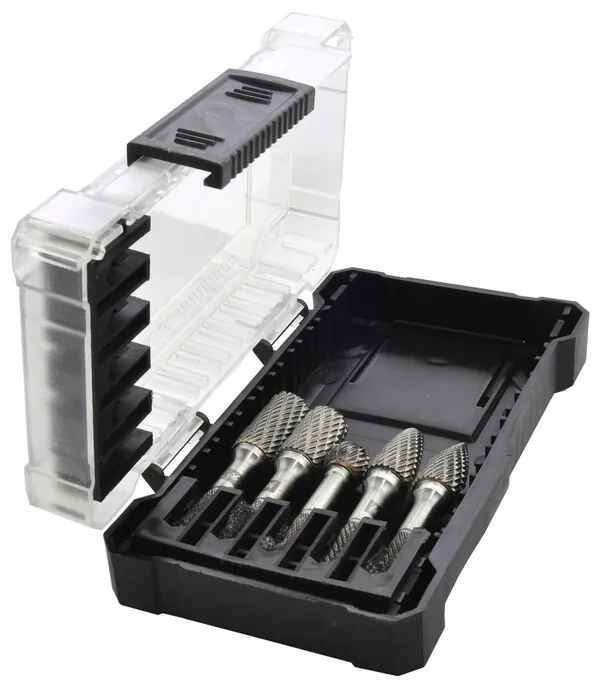 - Набор борфрез твердосплавных, тип B, C, D, F, G, Thorvik 8 мм, двойная насечка, в кейсе, 5 предметов TRRB080605-2S