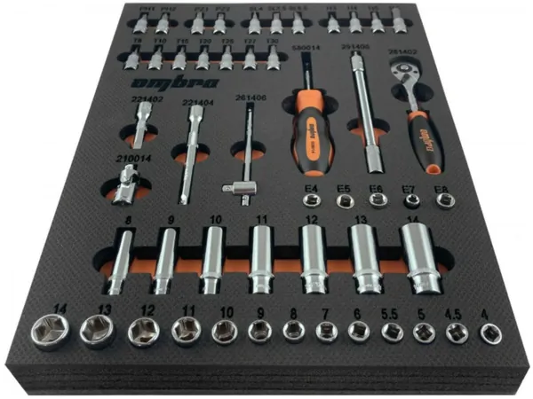 Набор головок торцевых Ombra 1/4" DR 4-14 мм, внешний TORX Е4-Е8 с аксессуарами в EVA ложементе 280х375 мм, 50 предметов OMT50STE 56137