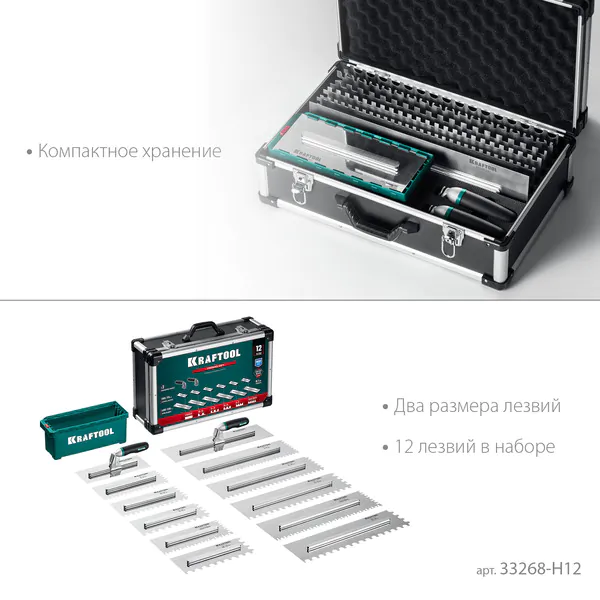 - KRAFTOOL 280х115 мм (6шт) - 480х130 мм (6шт), набор нержавеющих гребенок со сменной 2к ручкой, в пластиковом кейсе (33268-H12)