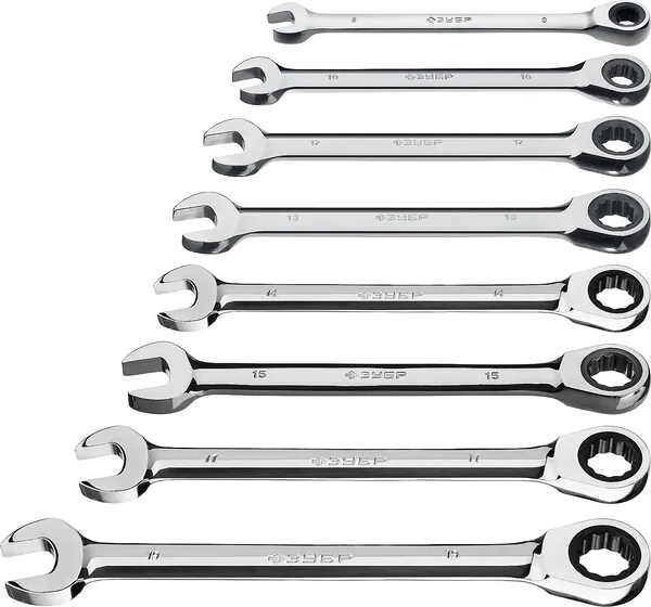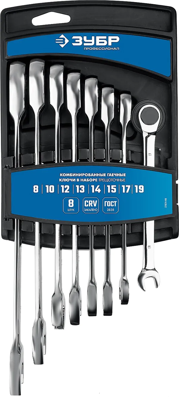 - ЗУБР 8 шт, 8 - 19 мм, набор комбинированных трещоточных гаечных ключей, Профессионал (27074-H8) 27074-H8_z01