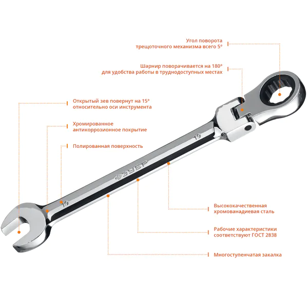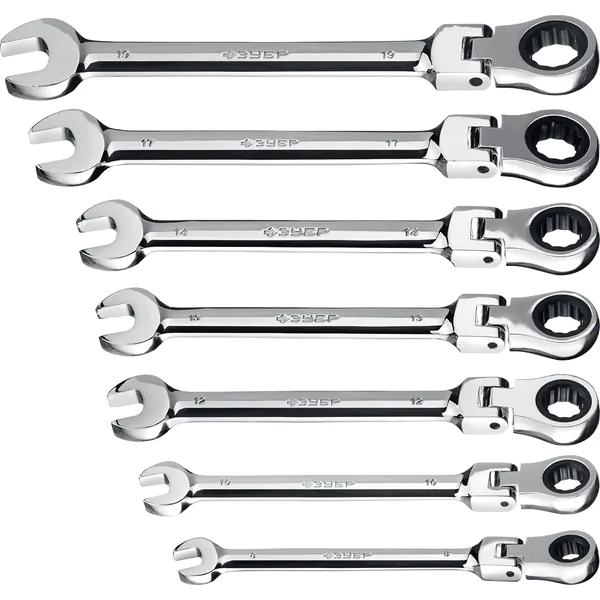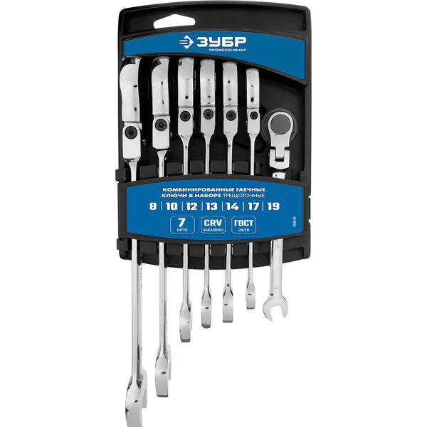 - ЗУБР 7 шт, 8 - 19 мм, набор шарнирных трещоточных гаечных ключей, Профессионал (27101-H7)