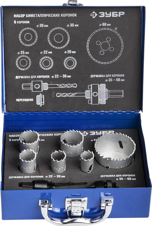 - ЗУБР 6 шт, сталь Р6М5, (20,22,25,30.35,60), набор биметаллических коронок (29531-H6-1)