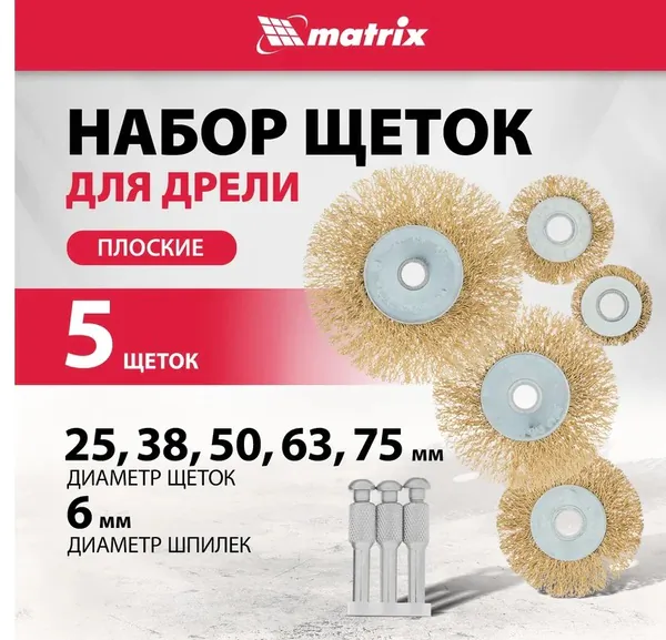 - • набор щеток Matrix для дрели, 5 шт. 25-38-50-63-75 мм, со шпильками 74494.