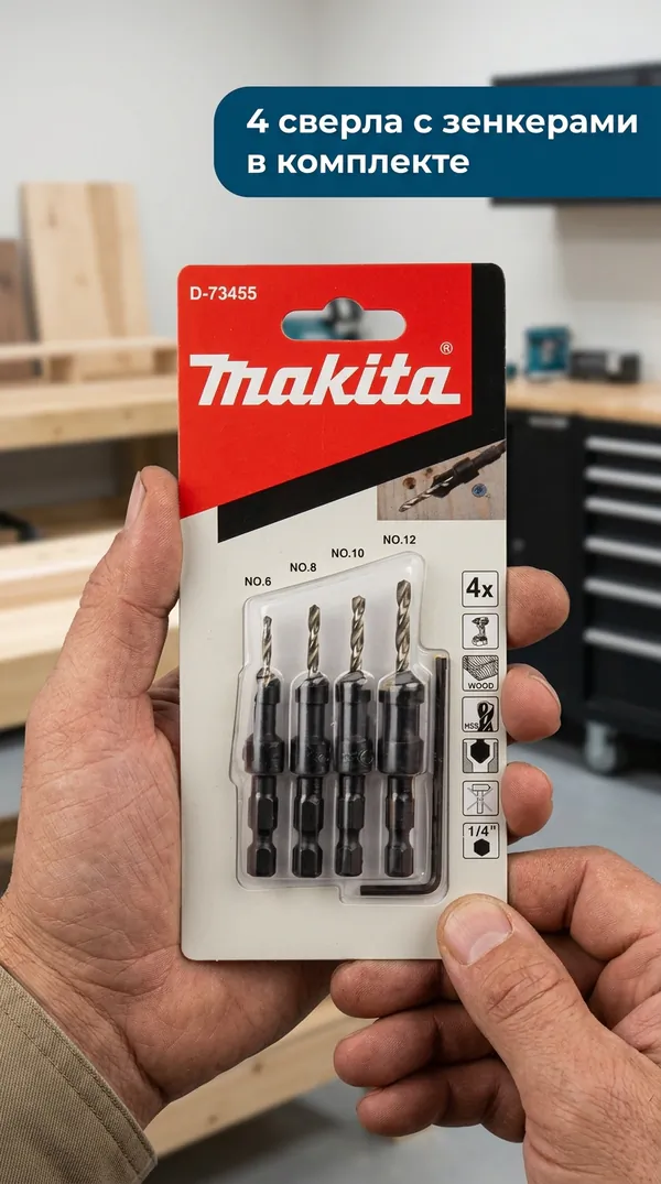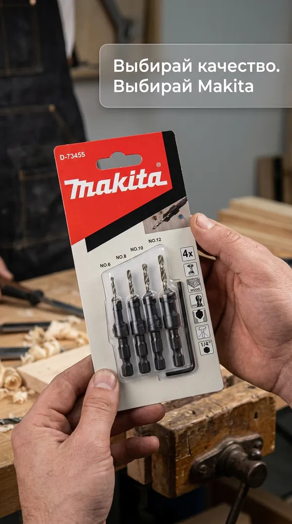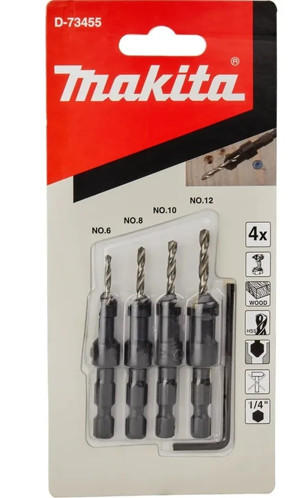 - • набор сверл по дереву с зенкерами Makita 1/4", 4 шт. D-73455.