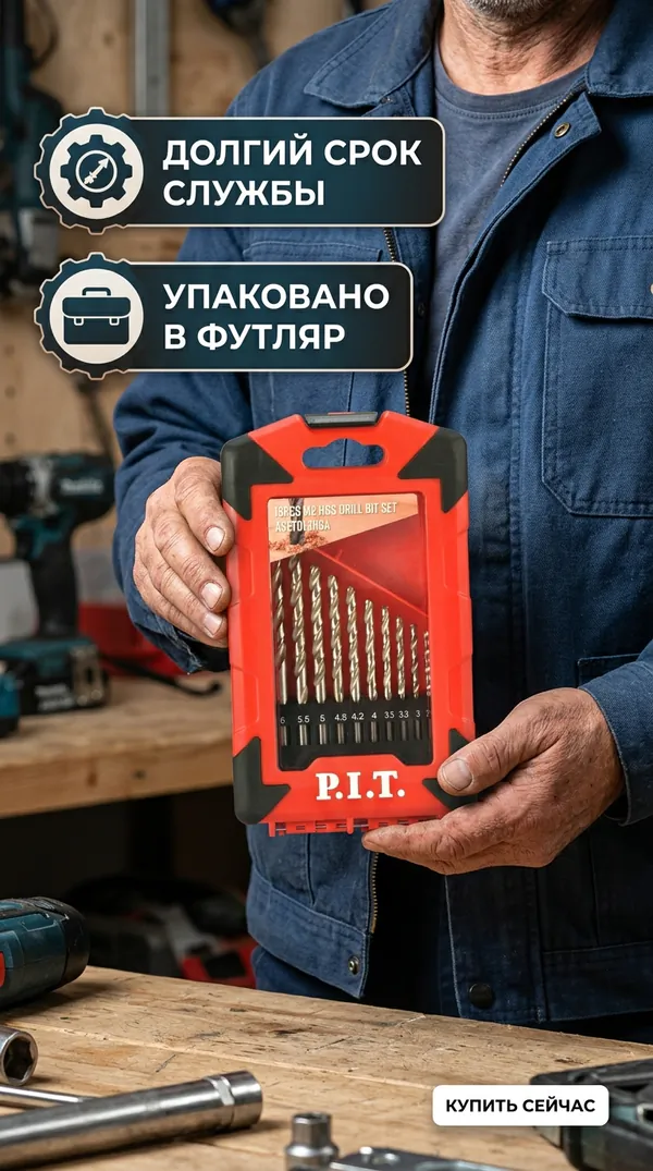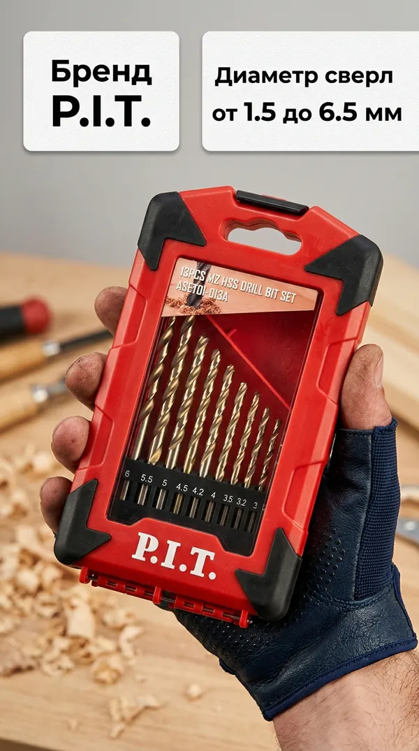 - • набор сверл по металлу P.I.T. 13 шт (1,5 - 6,5 мм с шагом 0,5 мм, + 4,2 мм и 3,2 мм) ASET01-013A.