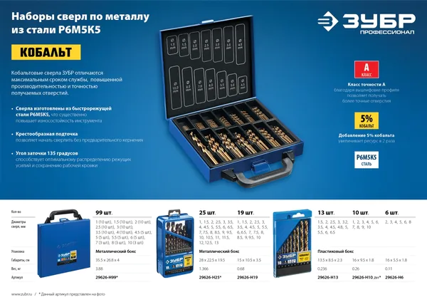 - ЗУБР Кобальт, 19 шт, (1-10 мм), сталь Р6М5К5, класс А, мет.бокс, набор сверл по металлу, Профессионал (29626-H19)