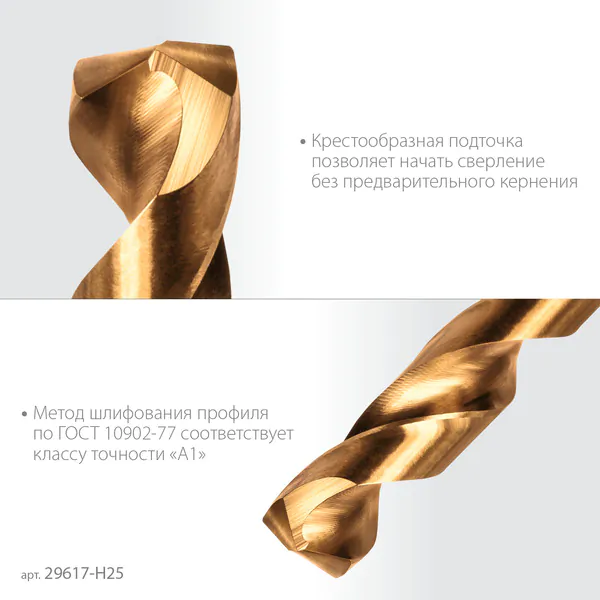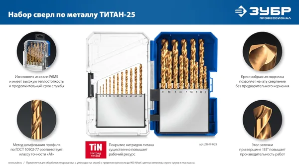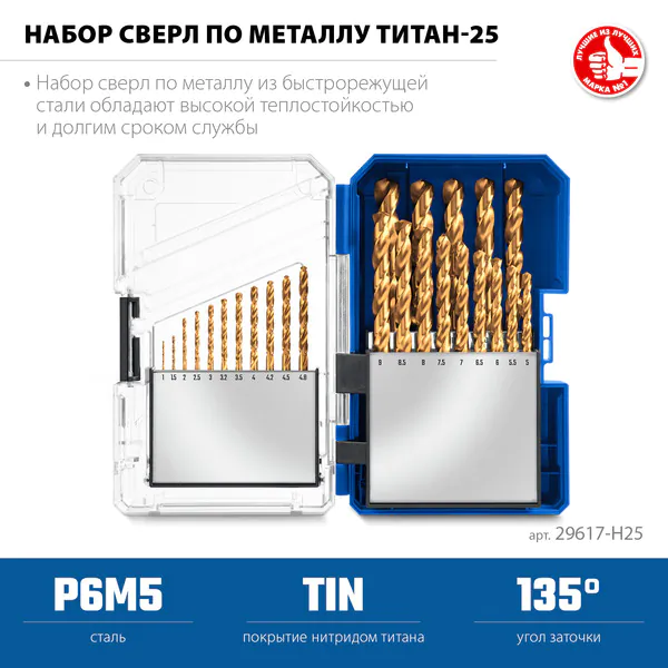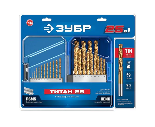 - ЗУБР ТИТАН 25шт (1-13мм) сталь Р6М5, класс А, титановое покрытие, пласт.бокс, набор сверл по металлу (29617-H25)