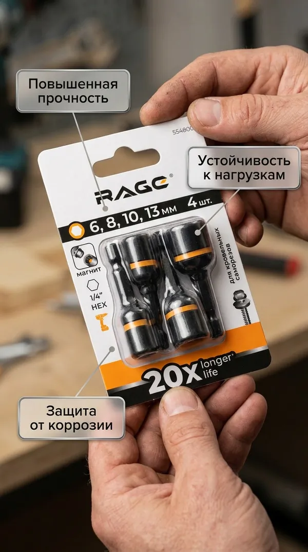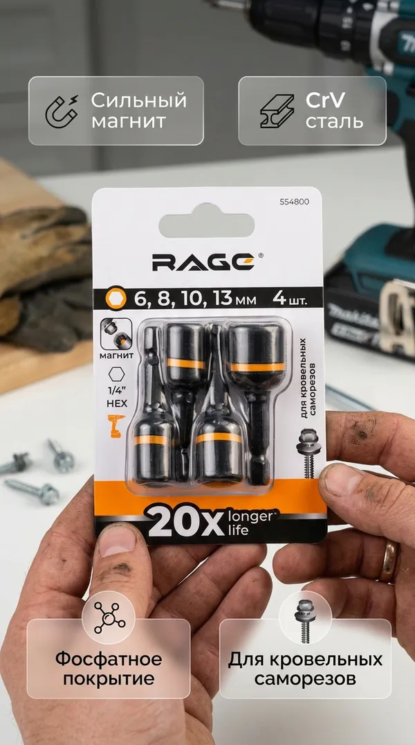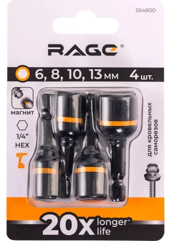 - • набор торцевых головок RAGE для кровельных саморезов 6,8,10,13 мм х 48 мм CrV HEX 554800.