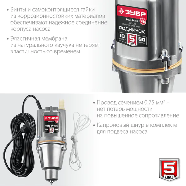 - ЗУБР Родничок-Н, 10 м, вибрационный насос с нижним забором (НВН-10)