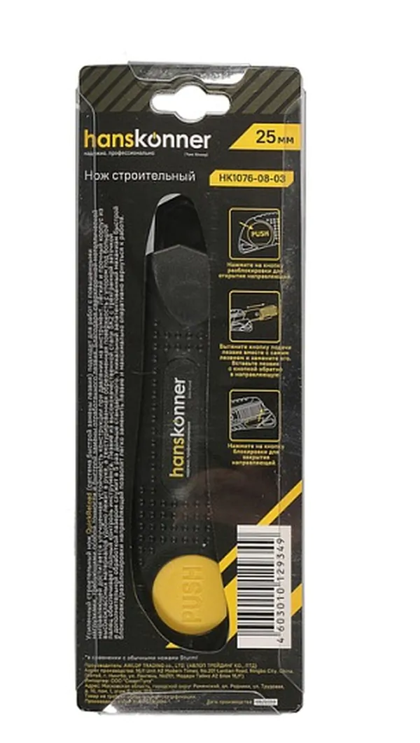 - • нож Hanskonner 25 мм, обрезиненный корпус, быстрая разблокировка, лезвие SK2 0.7 мм, HK1076-08-03.