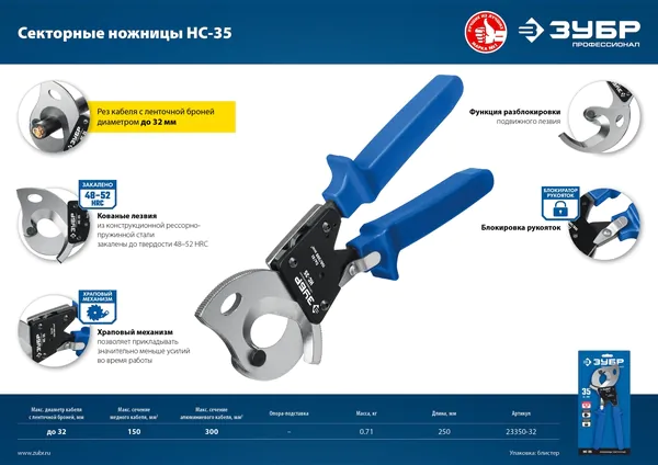 Сечение кабеля, мм²Условия гарантии1 год со дня продажиФиксаторДаУпаковкаЗакалка головыРазмер250Стальная кромкаДаТвердостьФиксатор лезвийДаХраповый механизмДаГабариты товара (ДхШхВ), мм310*155*25Масса нетто, кг0.794Комплектация