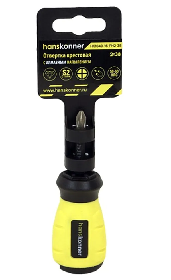 - • отвёртка крестовая Hanskonner 2x38 АЛМАЗН. НАКОНЕЧ, твердость 59 HRC, S2, HK1040-16-PH2-38.