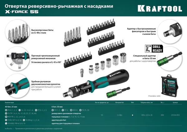 - KRAFTOOL Expert-55, 55 предм., реверсивная отвертка с насадками (25554-H55) 25554-H55_z01