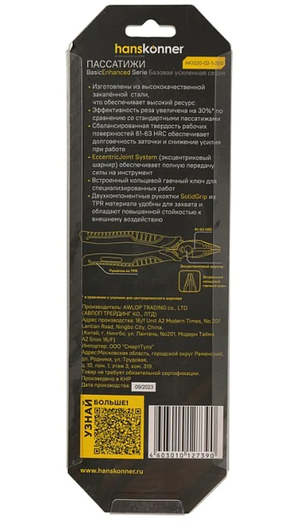 - • пассатижи Hanskonner 200 мм, эксц. шарнир,+30% к силе реза, TPR рукоятки, HK1020-02-1-200.