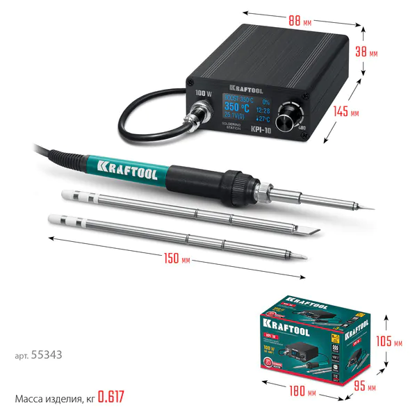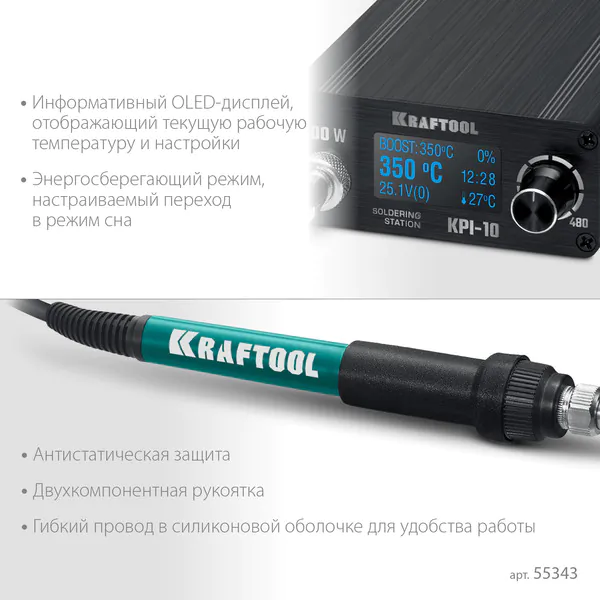 - KRAFTOOL KPI-10, 50 - 480°C, 100 Вт, 3 жала Т12, программируемая паяльная станция (55343)