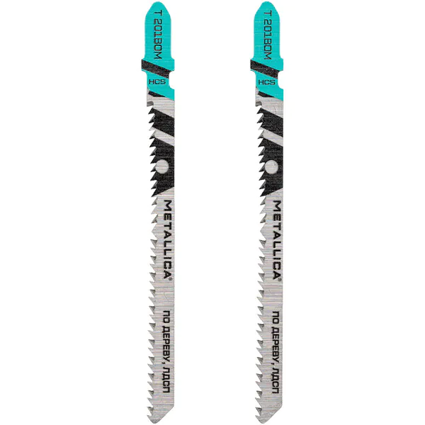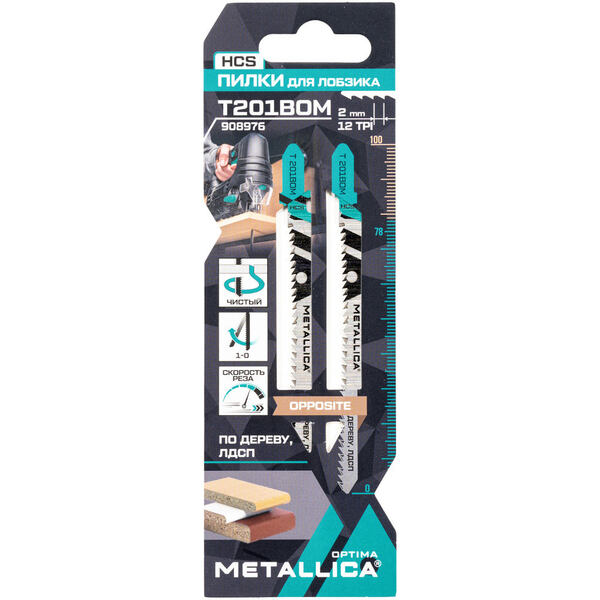 - • пилки для лобзика по дереву METALLICA Optima T201BOM 100/75 мм шаг 2 мм, HCS встреч/зуб крив/рез, 2 шт 908976.