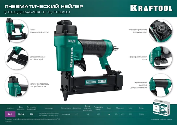 - KRAFTOOL P0.6/30 пневматический нейлер для шпилек 23Ga тип P0.6 (12-30 мм), (31963)