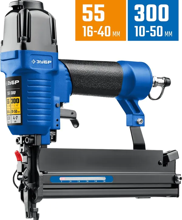 - ЗУБР Т55/300, пневматический нейлер-степлер 18Ga 2-в-1: для скоб тип 55 и гвоздей тип 300, Профессионал (31937)