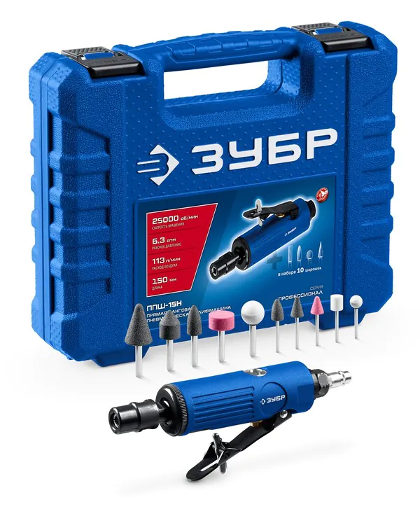 Пневмошлифмашина прямая цанговая Зубр ПРОФЕССИОНАЛ набор в кейсе:10 шарошек и оснастка 64330-H