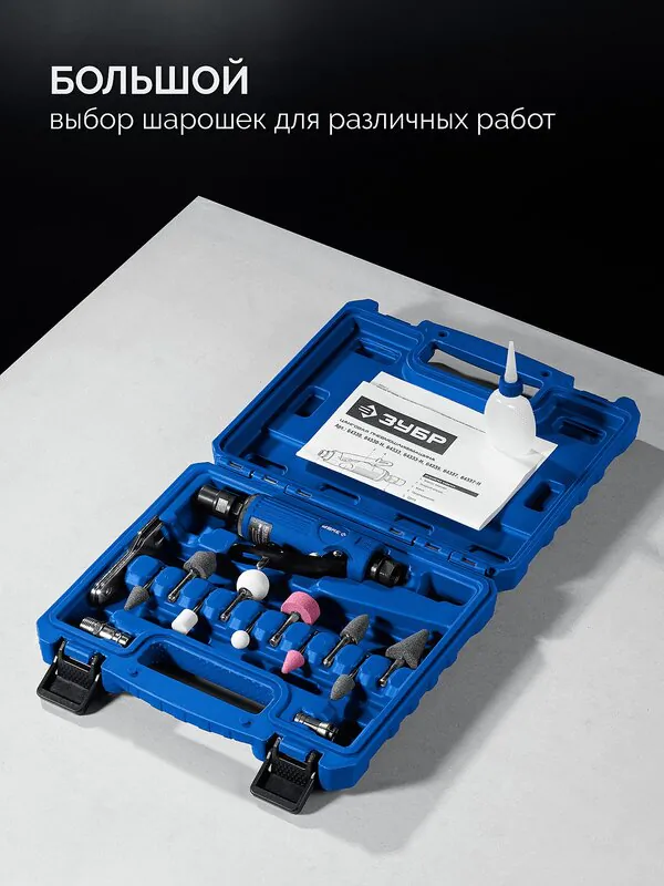 - ЗУБР набор в кейсе: прямая цанговая пневмошлифмашина, 10 шарошек и оснастка, ПРОФЕССИОНАЛ (64330-H)