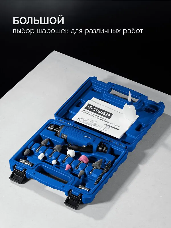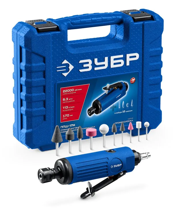 - ЗУБР набор в кейсе: прямая цанговая пневмошлифмашина, 10 шарошек и оснастка, ПРОФЕССИОНАЛ (64333-H)