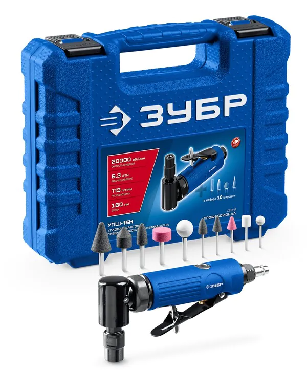 Пневмошлифмашина угловая цанговая ЗУБР ПРОФЕССИОНАЛ набор в кейсе: 10 шарошек и оснастка 64337-H