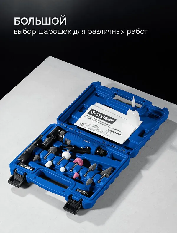 - ЗУБР набор в кейсе: угловая цанговая пневмошлифмашина, 10 шарошек и оснастка, ПРОФЕССИОНАЛ (64337-H)
