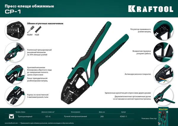 - KRAFTOOL CP-1, 0.5 - 6 мм2, для втулочных наконечников, пресс-клещи (45461-1)