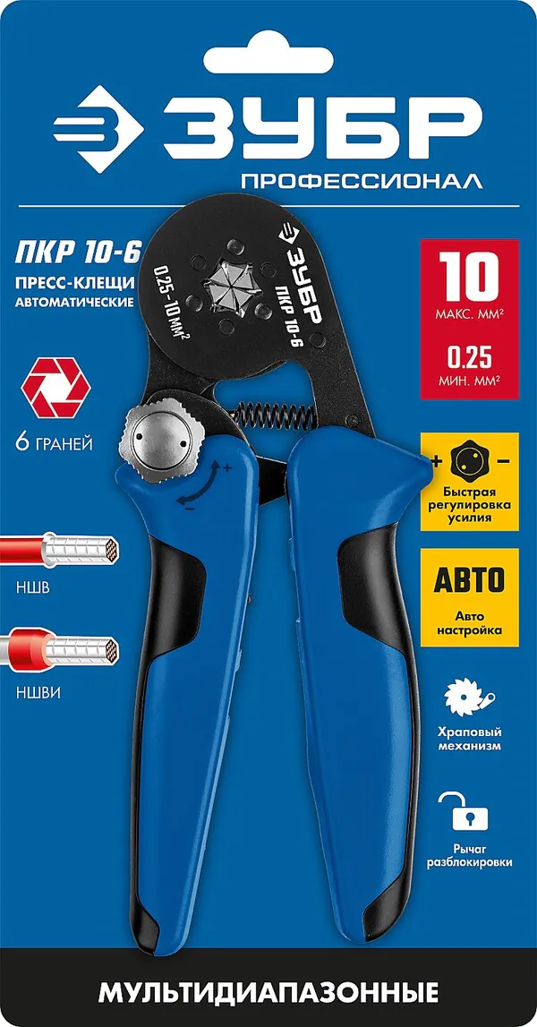 - ЗУБР ПКР-10-6, 0.25 - 10 мм2, с шестигранным профилем, мультидиапазонные пресс-клещи, Профессионал (22678)
