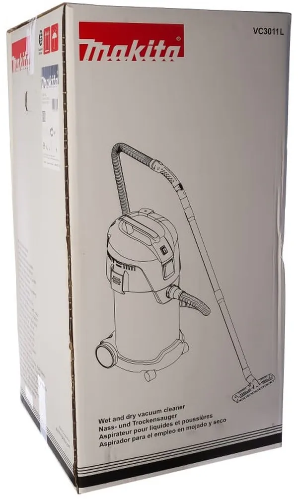 Max мощность, Вт1000Длина кабеля, м7.5Объем бака, л30Тип пылесборникаВозможность сбора жидкостиДаСистема очистки фильтраРозетка для электроинструментаДаВозможность работы без мешкаДаКласс пылиРегулировка мощностиНетФункция выдуванияДаВозможность влажной уборкиДаДлина всасывающего шланга, м3.5Материал корпусаРазрежение, мбар210Расход воздуха, л/минТип пылесосаМодельVC3011LПроизводительMakitaРодина брендаЯпонияСтрана изготовительКитайГарантия, мес12Условия гарантииСтандартная гарантия производителяДиаметр всасывающего шланга, мм32Напряжение питания, ВУровень шума, дБ72Габариты товара (ДхШхВ), мм630*400*410Масса нетто, кг10.5Габариты упаковки (ДхШхВ), мм770*400*400Вес брутто, кг12.6Комплектация