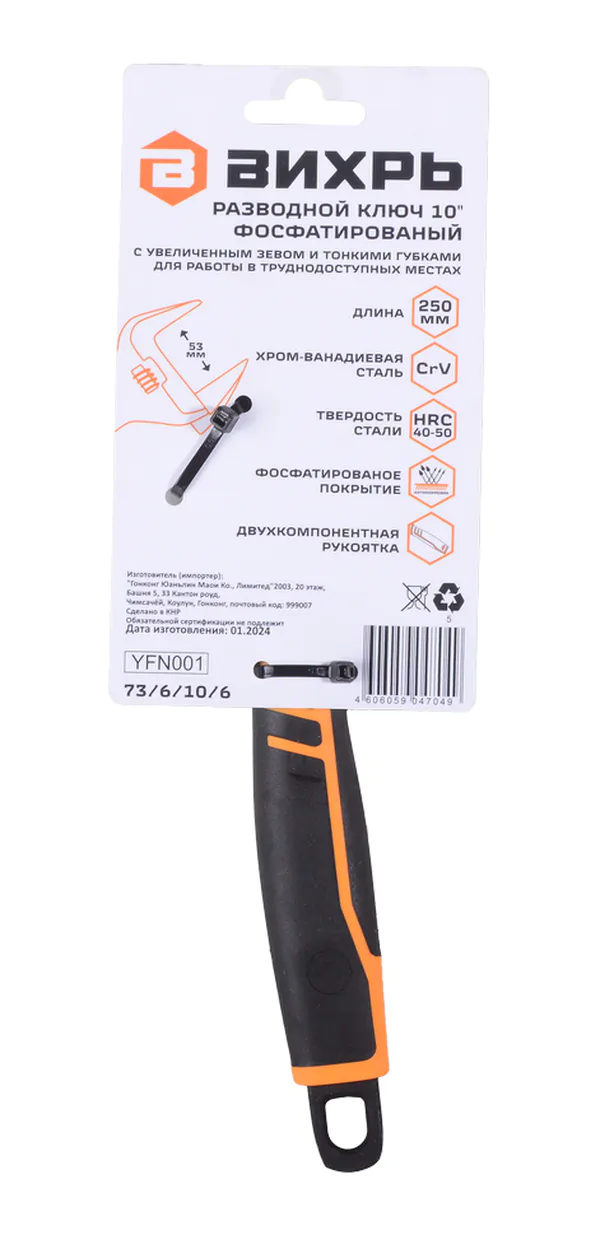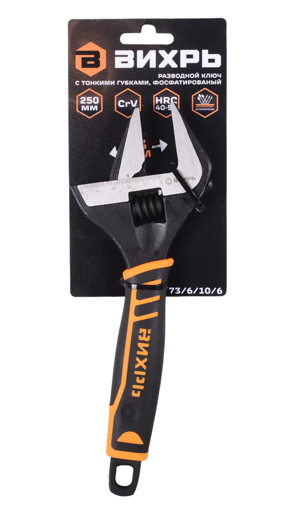 Разводной ключ с тонкими губками, фосфатированный, 250 мм, Вихрь 73/6/10/6