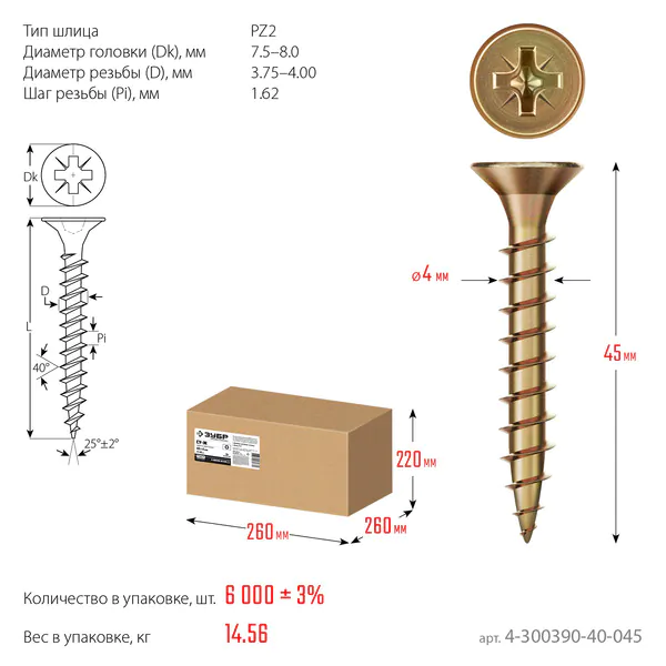 Саморез ЗУБР СУ-Ж 45 х 4.0 мм, желтый цинк, универсальный, 14.56 кг 4-300390-40-045_z01