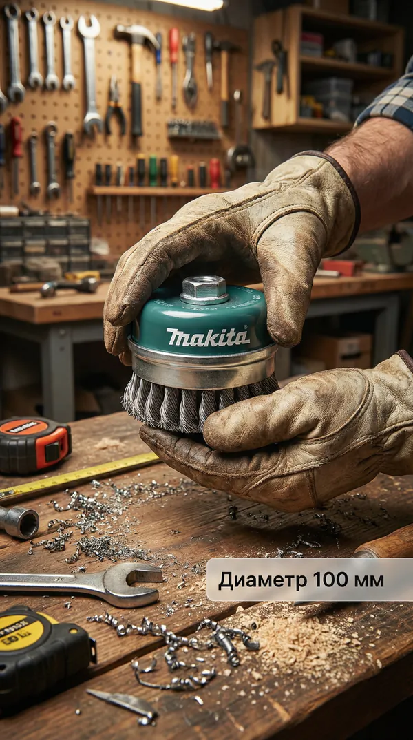 - • щетка проволочная чашечная Makita (d100 мм, толщ. проволоки 0.5 мм, пучки, металл, M14х2) D-29290.