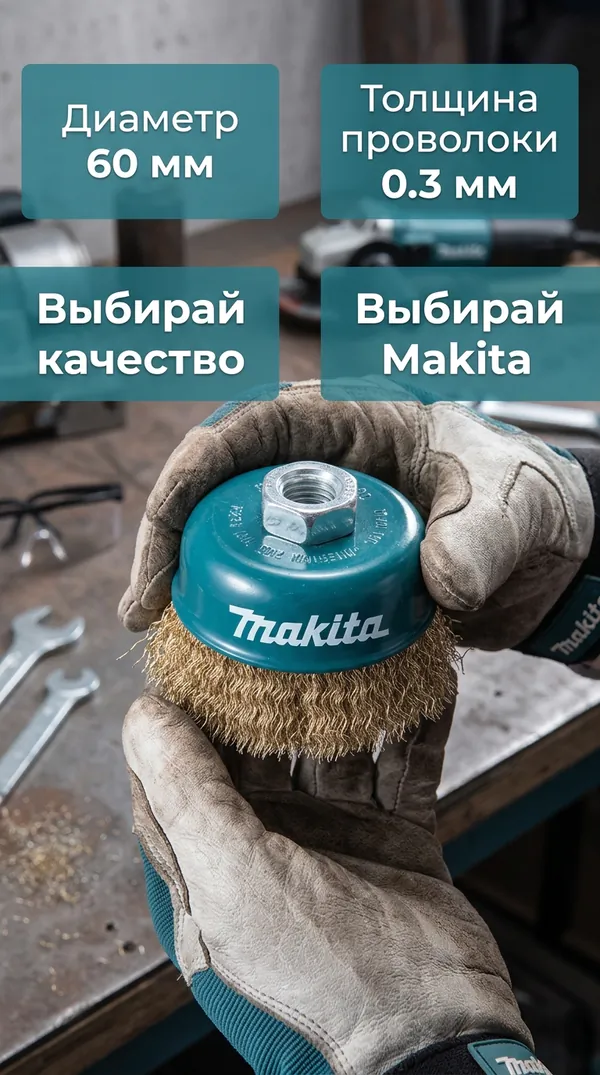 - • щетка проволочная чашечная Makita (d60 мм, толщ. проволоки 0.3 мм, гофрированная, латунь, M14x2) D-39746.