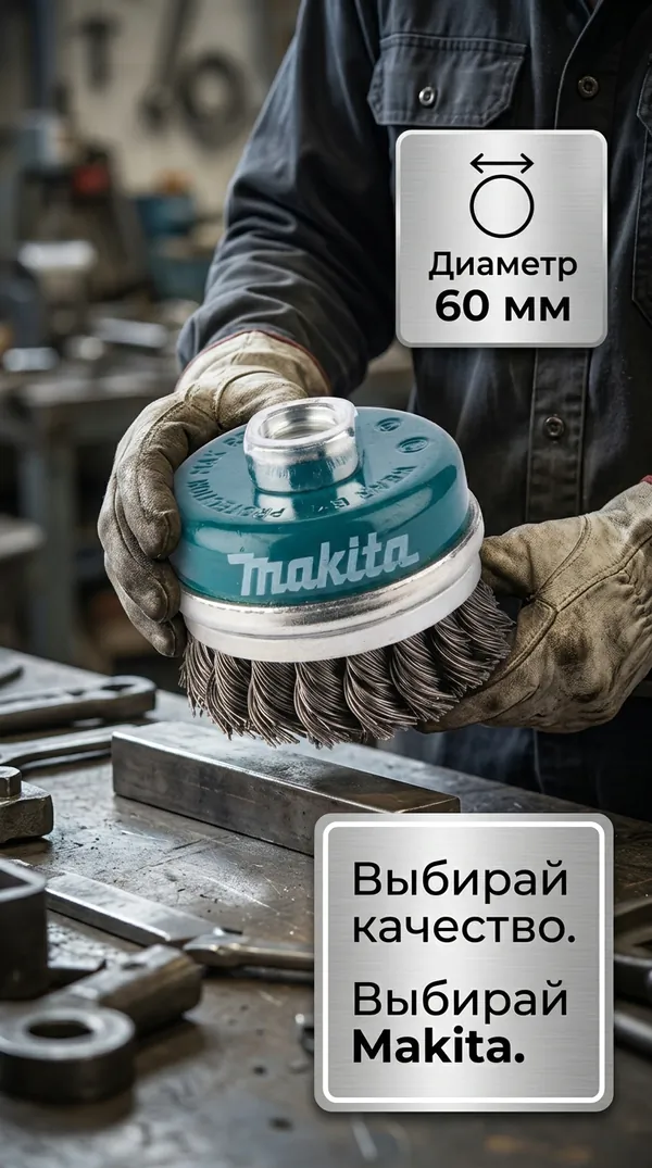 - • щетка проволочная чашечная Makita (d60 мм, толщ. проволоки 0.5 мм, пучки, металл, M14х2) D-24153.