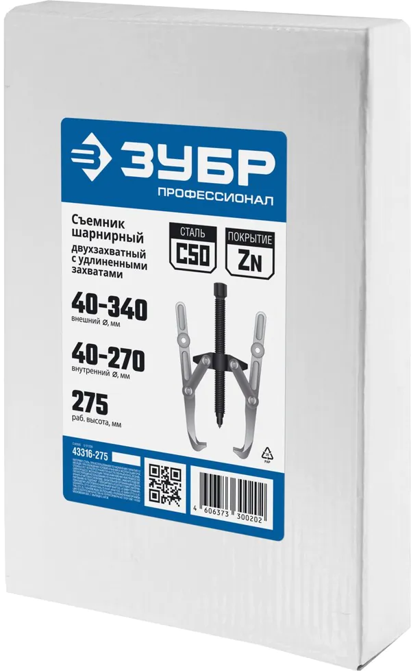 - ЗУБР внешний d 40 - 340 мм, внутренний d 40 - 270 мм, шарнирный двухзахватный съемник с удлиненными захватами, Профессионал (43316-275)