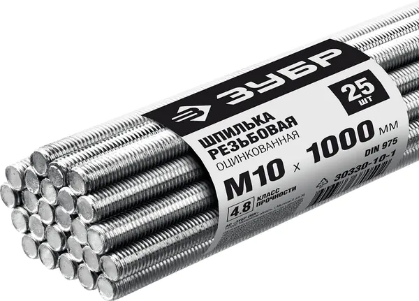 - ЗУБР DIN 975, кл. пр. 4.8, М10 х 1000 мм, цинк, 25 шт, резьбовая шпилька (30330-10-1)