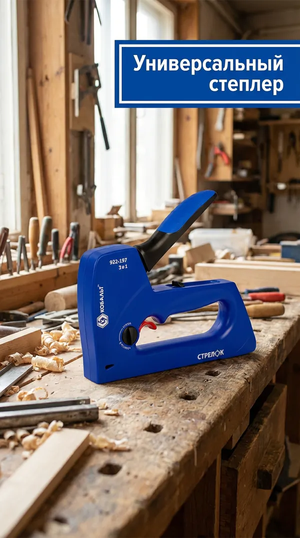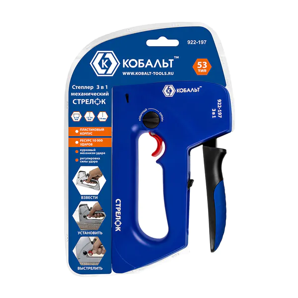 - • степлер механический КОБАЛЬТ СТРЕЛОК скобы 6-14 мм, тип 53, шпильки 12-14 мм, гвозди 14 мм 922-197.